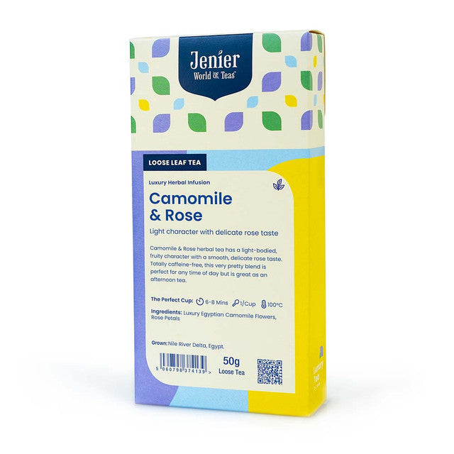 Camomile & Rose herbal tea offers a light, fruity profile complemented by a gentle, refined rose flavor. Completely caffeine-free, this elegant blend is ideal for any moment and pairs wonderfully with afternoon tea. Crafted from premium Egyptian camomile flowers and dried rose petals, it features first-grade, sun-dried leaves grown in Egypt's Nile Delta. The tea brews to a soft rosy pink hue with a subtly floral and fruity aroma, making it a sophisticated, soothing choice for herbal tea enthusiasts.